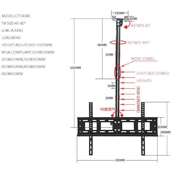 ტელევიზორი საკიდი ჭერზე ALLSCREEN TV Ceiling Mount Bracket CTC4080 TV SIZE: 40"-80"