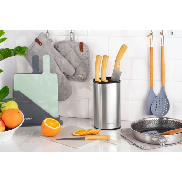 Ardesto AR2105WD Midori დანების 5-ცალიანი ნაკრები არის მაღალი ხარისხის და ფუნქციური სამზარეულოს აქსესუარი, რომელიც განკუთვნილია ყოველდღიური გამოყენებისთვის. უჟანგავი ფოლადის ბასრი პირები უზრუნველყოფს ზუსტ და მარტივ ჭრას, ხოლო ხის эрგონომიული სახელურები კომფორტულ და უსაფრთხო ჭერას. ელეგანტური ვერცხლისფერი და ხის კომბინაცია ქმნის სტილურ და თანამედროვე დიზაინს, რომელიც მარტივად შეერწყმება ნებისმიერ სამზარეულოს. ნაკრებში შედის 5 სხვადასხვა დანის ტიპი, რომლებიც შესანიშნავია ხორცის, ბოსტნეულის, პურის და სხვა ინგრედიენტების დასამუშავებლად.