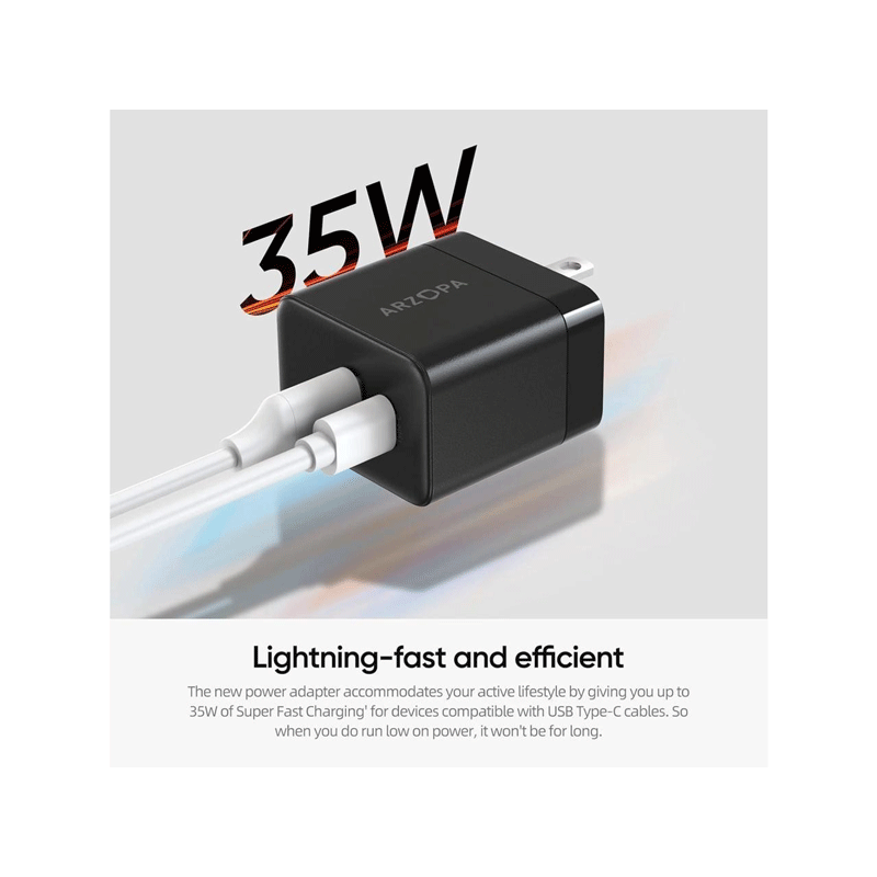 Arzopa C35 GaN Power Adapter არის კომპაქტური და მძლავრი დამტენი, რომელიც უზრუნველყოფს 35W სიმძლავრის სწრაფ დატენვას. მისი GaN (გალიუმის ნიტრიდი) ტექნოლოგია უზრუნველყოფს მაღალ ენერგოეფექტურობას და კომპაქტურ ზომებს, რაც იდეალურია როგორც სახლის, ისე მოგზაურობისთვის. დამტენი აღჭურვილია USB-A და USB-C პორტებით, რაც საშუალებას გაძლევთ ერთდროულად დატენოთ სხვადასხვა მოწყობილობა, მათ შორის სმარტფონები, ტაბლეტები და პატარა ლეპტოპები. Arzopa C35 გამოირჩევა უსაფრთხოების მულტიფუნქციური სისტემით, რომელიც იცავს მოწყობილობებს გადახურების, გადატვირთვისა და მოკლე ჩართვისგან.