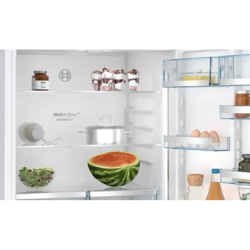 მაცივარი BOSCH KGP76AWC0N არის თანამედროვე და ენერგოეფექტური მოწყობილობა, რომელიც აერთიანებს მაღალ ხარისხს, გამძლეობასა და დახვეწილ დიზაინს. მისი საერთო მოცულობა 521 ლიტრია, რაც საკმარისია დიდი ოჯახის ან ფართო სამზარეულოს საჭიროებისთვის. BOSCH-ის ინოვაციური NoFrost სისტემა გამორიცხავს ყინულის დაგროვებას და უზრუნველყოფს პროდუქტების ხანგრძლივ სიგრილეს მინიმალური მოვლის პირობებში. VitaFresh Plus ზონა ინარჩუნებს ხილსა და ბოსტნეულს ახალ მდგომარეობაში დიდხანს, ხოლო MultiAirflow სისტემა უზრუნველყოფს ტემპერატურის თანაბარ განაწილებას მთელ კამერაში. SuperCooling და SuperFreezing ფუნქციები საშუალებას გაძლევთ სწრაფად გაცივოთ ახლად მოთავსებული პროდუქტი, ენერგოეფექტურობის შენარჩუნებით. თეთრი ფერის კლასიკური დიზაინი, ელექტრონული ტემპერატურის კონტროლი და LED განათება ქმნის კომფორტს და ესთეტიკას. BOSCH KGP76AWC0N — იდეალური არჩევანი სანდოობისა და სისუფთავის კომბინაციისთვის.