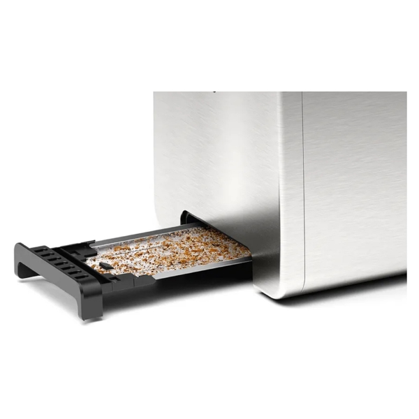 ტოსტერი BOSCH TAT4P420 არის მძლავრი და სტილური მოწყობილობა, რომელიც განკუთვნილია გემრიელი და ხრაშუნა ტოსტის სწრაფად და მარტივად მოსამზადებლად. მისი 970 ვატიანი სიმძლავრე უზრუნველყოფს პურის თანაბრად და ხრაშუნა შეწითლებას. ტოსტერს აქვს ორი სლოტი, რომლებიც შესაფერისია სხვადასხვა სისქის პურისთვის. აღჭურვილია რეგულირებადი შეწითლების კონტროლით, რომელიც საშუალებას გაძლევთ აირჩიოთ სასურველი დონე. "Defrost", "Reheat" და "Cancel" ფუნქციები ზრდის მოხმარების კომფორტს. ტოსტერს აქვს მაღალი ამომრთველი მექანიზმი, რაც უზრუნველყოფს პურის მარტივ ამოღებას. მისი ელეგანტური და თანამედროვე დიზაინი იდეალურად ერწყმის ნებისმიერ სამზარეულოს ინტერიერს. BOSCH TAT4P420 - სტილი, სიმარტივე და გემრიელი საუზმე ერთ მოწყობილობაში.
