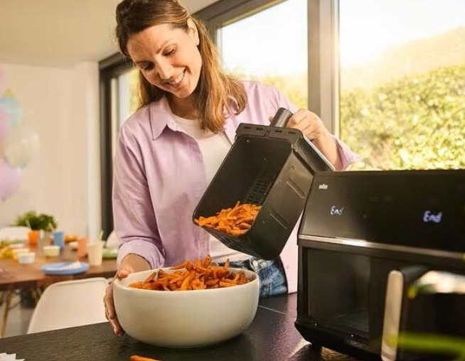 აეროგრილი BRAUN TD5030IBK არის ინოვაციური სამზარეულო მოწყობილობა, რომელიც საშუალებას გაძლევთ მოამზადოთ თქვენი საყვარელი კერძები უფრო სწრაფად, ჯანსაღად და გემრიელად. Rapid Air ტექნოლოგია უზრუნველყოფს ცხელი ჰაერის თანაბარ განაწილებას, რაც იძლევა ხრაშუნა ტექსტურას და ოქროსფერ ფერს ზეთის გარეშე ან მინიმალური რაოდენობით. მოწყობილობა აღჭურვილია 10 ლიტრიანი მოცულობით, რაც იდეალურია ოჯახური პორციებისთვის. ციფრული პანელი და წინასწარ დაპროგრამებული რეჟიმები აადვილებს სხვადასხვა კერძის — ბოსტნეულის, ქათმის, კარტოფილის ან დესერტების — მომზადებას. რეგულირებადი ტემპერატურა და დრო გაძლევთ სრულ კონტროლს მომზადების პროცესზე. მოხსნადი კალათა მარტივად იწმინდება და თავსებადია ჭურჭლის სარეცხ მანქანასთან. ელეგანტური შავი დიზაინი და კომპაქტური ფორმა BRAUN TD5030IBK-ს აქცევს პრაქტიკულ და სტილურ დანამატად ნებისმიერი სამზარეულოსთვის.
