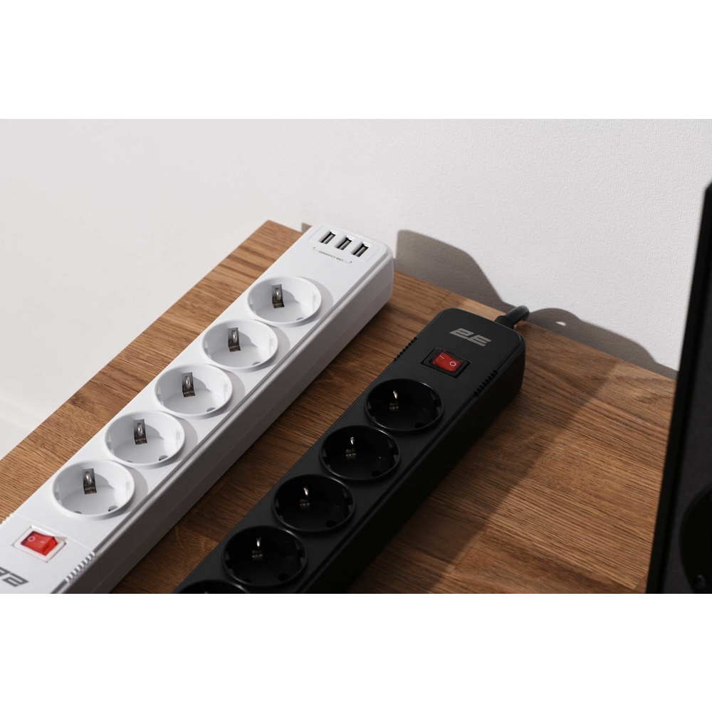 Power Strip 2E 2E-SP515M2USBBK, 5 Socket, 3xUSB-A, 2m, Power Strip With Surge Protector, Black