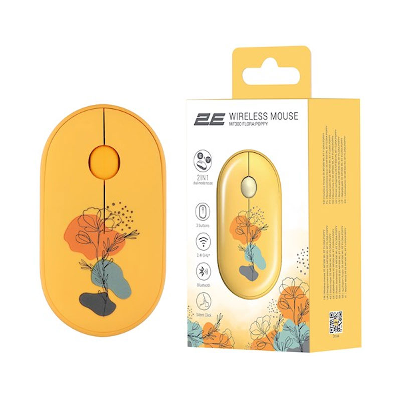 The 2E MF300 Flora Poppy Silent WL BT mouse is distinguished by its unique yellow design, silent click and modern technologies. Dual connection – 2.4GHz wireless receiver and Bluetooth technology – provides stable and fast work with various devices. Silent Click technology allows you to work as quietly as possible, which is ideal for both office and home use. Ergonomic shape and lightweight design provide comfort during long work. High-precision optical sensor provides stable movement on any surface.