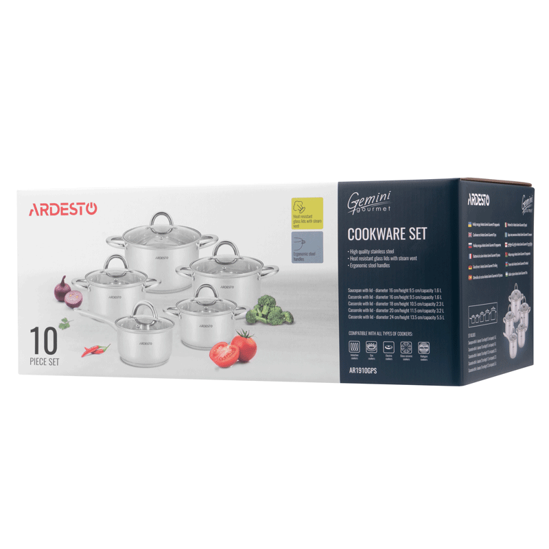 The Ardesto AR1910GPS saucepan set is the perfect combination of functionality and sophisticated design. Made of high-quality stainless steel, it ensures durability and even heat distribution, which contributes to fast and high-quality food preparation. The set includes saucepans of different sizes, which are ideally suited to different needs, whether it is daily cooking or preparing a large table. Transparent lids facilitate constant control of the process, and thermally insulated handles provide comfort and safety. The Ardesto AR1910GPS is compatible with all types of stoves, including induction surfaces, which makes it a universal and multifunctional choice. Easy cleaning and maintenance of the cookware ensure its long-lasting shine and durability, making it an ideal choice for any modern kitchen.