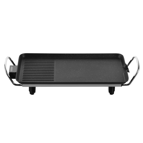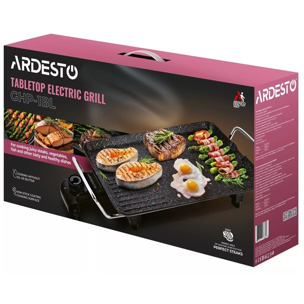 Ardesto GHP‑1BL 1500W electric grill follows the real barbecue – in any kitchen. Its washable non-stick ribbed plate ensures crispy grilling of meat, vegetables, or fish, with a adjustable thermostat from 60° to 240 °C. Thanks to ultra-fast heating and portable design (ergonomic handles, non-slip feet), using the Grill is convenient and safe. Excess fat collects in a container, resulting in healthy and tasty dishes. A 1 m power cord and overheating protection system are included. Easy to clean: the plate can be washed just like regular dishes. This is the perfect choice for daily grilling for one or small families, both mindful and quick preparation.