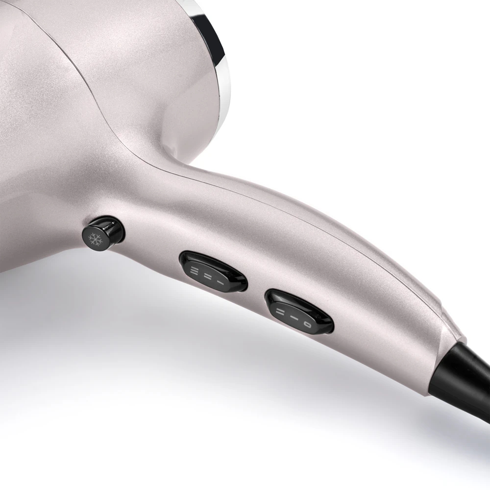 The BaByliss D781E Mauve Lustre hair dryer is a powerful and stable choice for smooth, voluminous, and healthy hair. The 2300-watt motor ensures fast drying and noticeable results on any hair type. The device features three temperature and two speed settings for styling customization, while Ionic technology reduces static and increases hair elasticity. The cool air button helps to set hairstyles and maintain shine. The lightweight design and 2.2-meter cord provide comfort during use, and the removable filter is easy to clean. The package includes a precise concentrator for targeted styling and a hanging ring for safe storage.