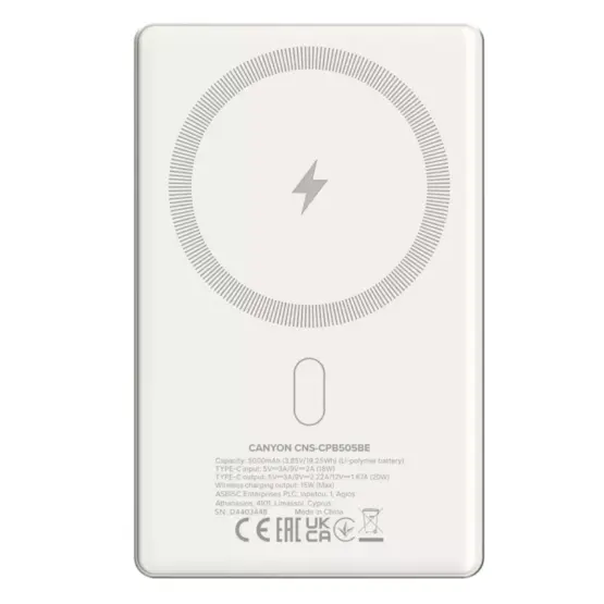 The Canyon OnPower 505 Slim Magnetic 5000 Beige (CNS-CPB505BE) is an elegant, compact, and functional power source that is ideal for everyday use. With a capacity of 5000mAh, it ensures your smartphone and other devices can be charged anywhere, while the magnetic system provides a secure and stable connection to the device. The slim design and lightweight construction allow easy carrying in a bag or pocket. The USB-C port and 15W fast charging technology reduce charging time and increase convenience. The multi-layer protection mechanism safeguards against overcharging, overheating, and short circuits. The beige color and minimalist shape give the Canyon OnPower 505 a modern, stylish look, making it the perfect companion for active users.