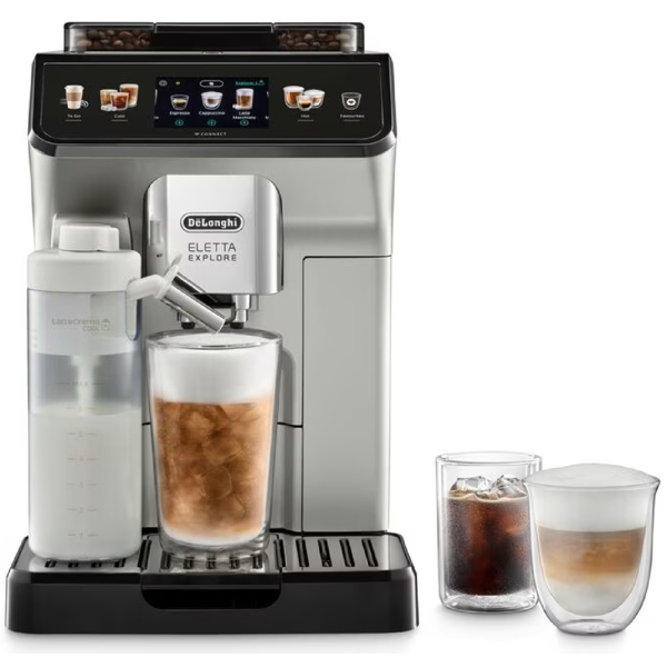 DeLonghi ECAM450.65.S Eletta Explore is a fully automatic coffee machine that combines innovative technologies and elegant design. The LatteCrema Hot and LatteCrema Cool systems provide the ideal texture of milk foam for both hot and cold drinks. Cold Extraction technology allows you to prepare Cold Brew coffee in less than 5 minutes. The machine offers more than 40 pre-programmed drinks, which can be prepared with a single touch from the 3.5-inch color touchscreen. Bean Adapt technology automatically adjusts the machine's settings according to the type of coffee bean, ensuring ideal extraction. The built-in steel conical grinder with 7 grinding levels ensures the purity and fragrant aroma of coffee beans. The machine is equipped with a 1.8 liter water tank, a 300 gram bean container and a 19 bar pressure pump. Wi-Fi connectivity and the Coffee Link app allow you to control the machine remotely.