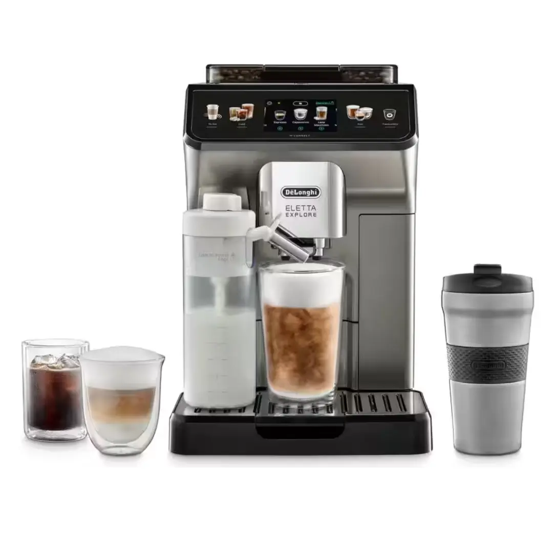 The Delonghi ECAM450.86.T EX:4 coffee machine is a fully automatic device designed to bring a professional coffee-making experience to your home. Its 4.3-inch color touchscreen and Coffee Link app allow you to easily control the machine and customize all parameters of your drinks. The LatteCrema system creates smooth and rich froth for cappuccinos and lattes, while the ceramic grinder operates coffee beans perfectly with 13 settings. The Delonghi ECAM450.86.T EX:4 is compatible with both whole and ground coffee, and the automatic cleaning function simplifies daily maintenance. Its elegant design, compact size, and high-quality materials make it the best choice for those who want comfort, a variety of drinks, and a refined style in one device.