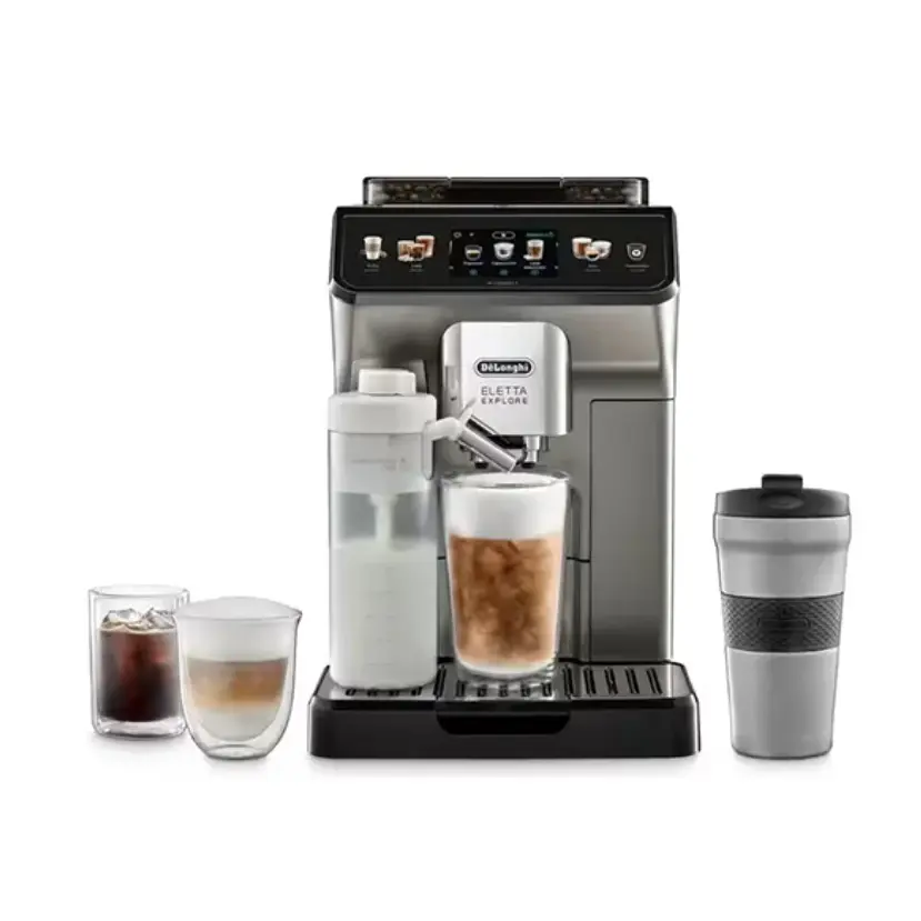 DeLonghi ECAM450.86.T Eletta Explore is a fully automatic coffee machine that combines innovative technologies and elegant design. The LatteCrema Hot and LatteCrema Cool systems provide the ideal texture of milk foam for both hot and cold drinks. Cold Extraction technology allows you to prepare Cold Brew coffee in less than 5 minutes. The machine offers more than 50 pre-programmed drinks, which can be prepared with a single touch from the 3.5-inch color touchscreen. Bean Adapt technology automatically adjusts the machine's settings according to the type of coffee bean, ensuring ideal extraction. The built-in steel conical grinder with 13 grinding levels ensures the purity and fragrant aroma of coffee beans. The machine is equipped with a 1.8 liter water tank, a 300 gram bean container and a 19 bar pressure pump. Wi-Fi connectivity and the Coffee Link app allow you to control the machine remotely.