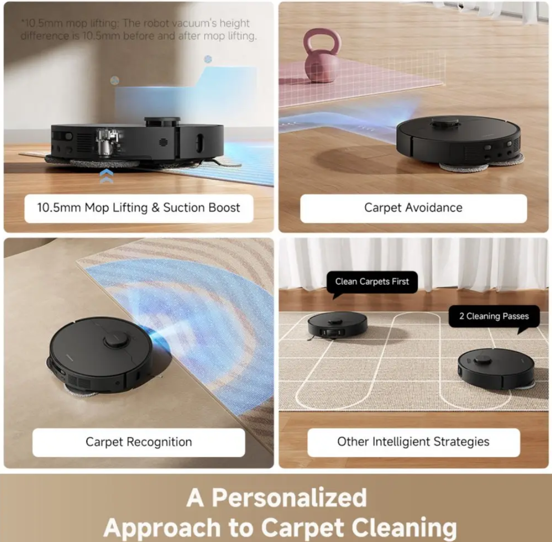 - Carpet Recognition: Ultrasonic sensors automatically detect carpets and adjust the cleaning mode accordingly (e.g., increase suction, lift/remove mop).