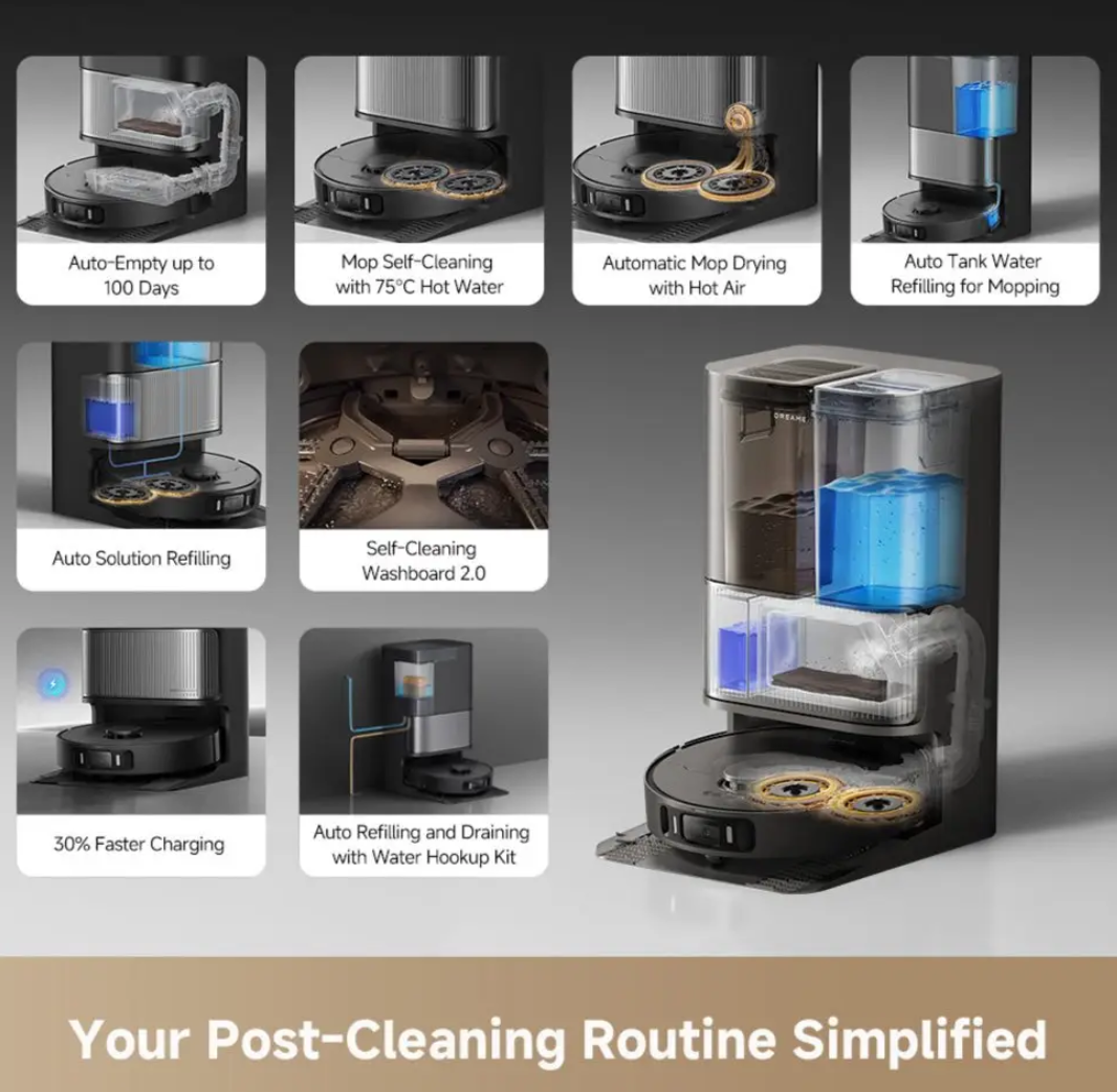 - Automatic Clean Water Refill: Fills the robot’s water tank from the station’s 4.5 L clean water tank.