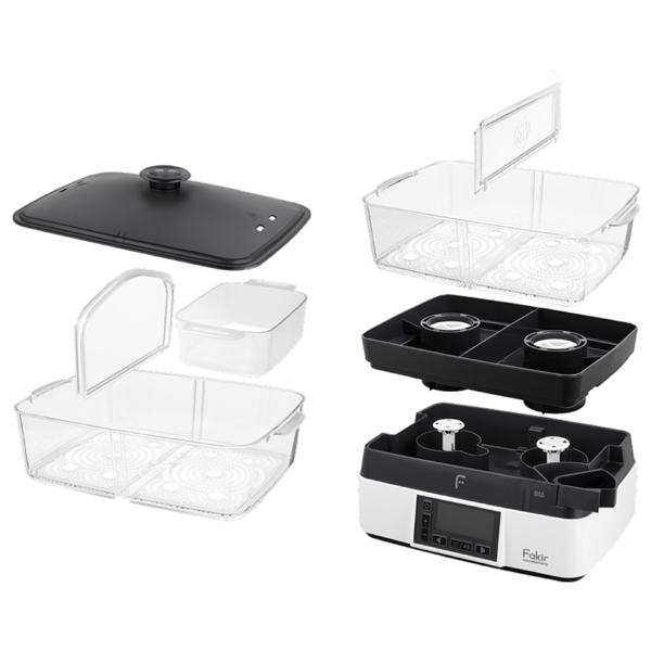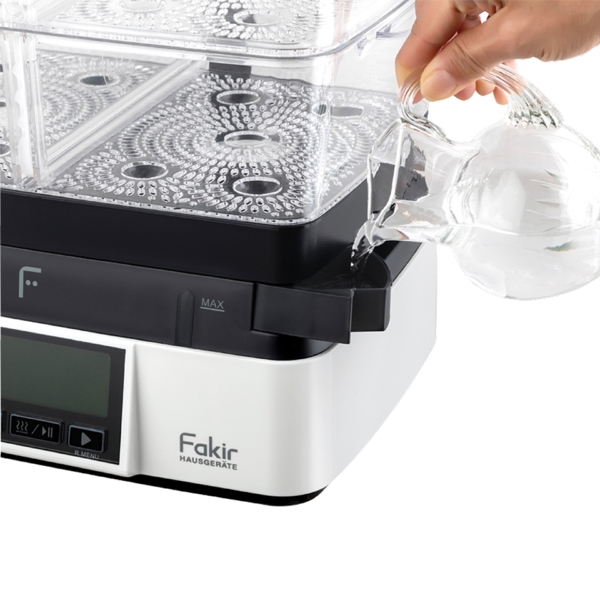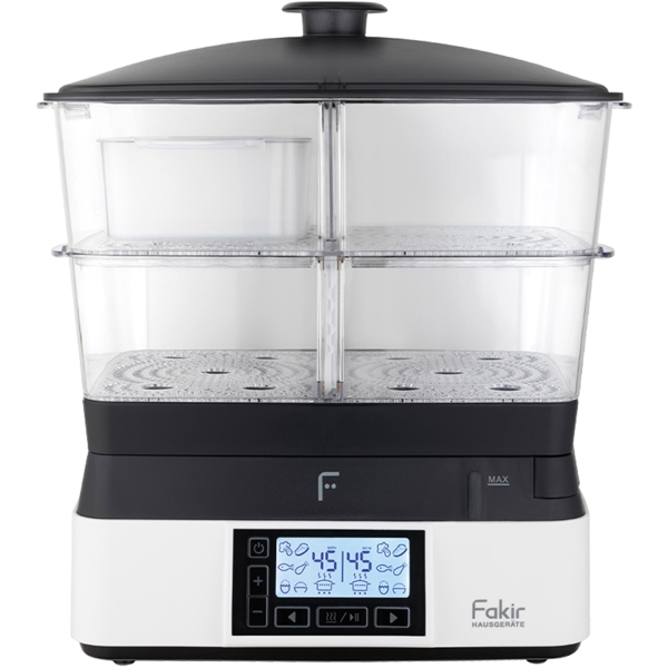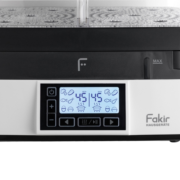 The FAKIR PREMIUM STEAM STEAM COOKER is the perfect device for health food enthusiasts. The steaming technology retains more vitamins, minerals, and natural flavors in the products, resulting in dishes that are juicier and more natural. The multi-tier containers allow you to cook several dishes at once, such as vegetables, fish, meat, or even dessert. The PREMIUM STEAM model uses energy much more efficiently and reduces the time spent in the kitchen. The simple panel ensures intuitive control. It is a practical and reliable solution for daily, quick, and healthier meals for the whole family.