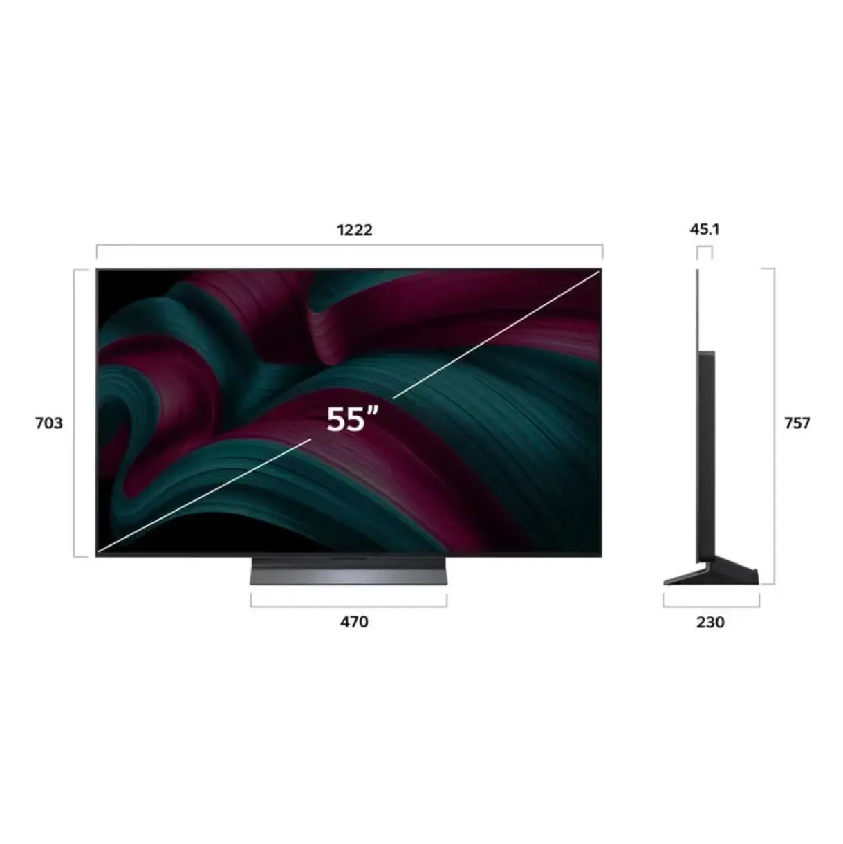The LG OLED55C5RLA.AMCN television is a 55-inch model based on OLED technology, featuring infinite contrast, precise colors, and incredible viewing angles. The α9 Gen6 AI Processor 4K enhances the image and sound quality, creating a realistic visual and audio experience. Dolby Vision and Dolby Atmos technologies provide a theater-like feeling at home. With smart features and the webOS platform, the television offers easy access to a variety of applications, voice assistants, and content. Its refined design, thin profile, and wall-mounting capability make it an ideal choice for modern interiors.