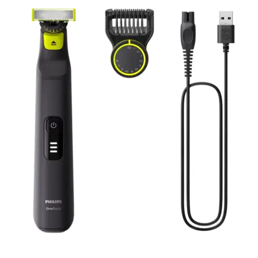 Philips QP6532/10 OneBlade Pro 360 Face — a multifunctional shaver that allows you to control trimming, edging, and full shaving with one device. Advantages: 360° contour adaptation using a printed trimmer that conforms to all lines of the face and body. Innovative "Contour Following" technology and a dual-sided blade make shaving comfortable and efficient. The adjustable comb with 12 length settings ranges from 0.5 to 9 mm for hair trimming, and an additional attachment refines precise styling lines. The Li-Ion battery charges in just 1 hour and provides 90 minutes of continuous use. The device is fully waterproof (IPX7), making cleaning easy — just rinse it under water. The digital LED indicator notifies you of the charging status and operating needs.