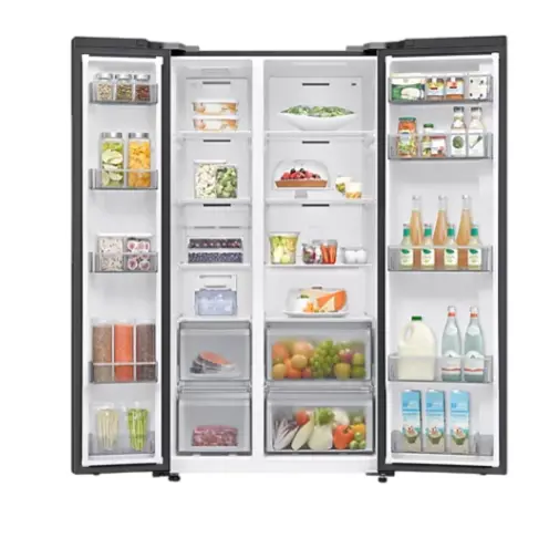 The Samsung RS70F65Q1TWR is a modern Side-by-Side fridge that offers a massive total capacity of 680 liters, with 647 liters being practically usable. It is equipped with a digital inverter compressor and Twin Cooling technology, ensuring constantly optimal temperature, high energy efficiency (class A+), and quiet operation (38 dB). SpaceMax technology allows for more internal space without reducing external dimensions. Additional features include quick cooling and freezing, LED lighting, 4 sturdy glass shelves, 2 crisper drawers, an egg container, and Wi-Fi support for SmartThings device management for energy management. The compact form (912×1780×716 mm) and elegant gray color create harmony with any kitchen interior.
