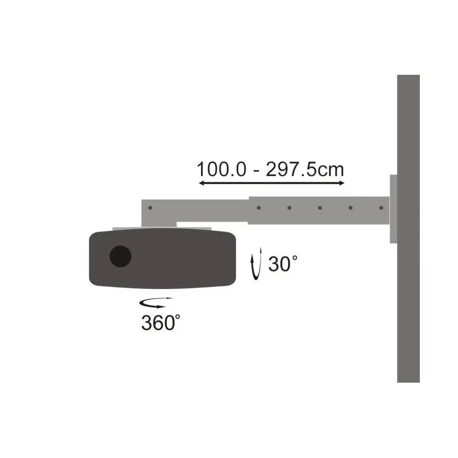 The SBOX PM-300-3.0 is a wall mount designed for secure and stable installation of projectors. Its adjustable length from 1000 mm to 2975 mm allows you to adapt the mount to different space requirements. The mount provides 30° tilt and 360° swivel capabilities, allowing you to position the projector in the optimal position. The maximum load capacity is 15 kg, and the maximum distance between the mount holes is 336 mm, which ensures compatibility with various projector models. Its sturdy construction and quality materials ensure long-term use and reliability.