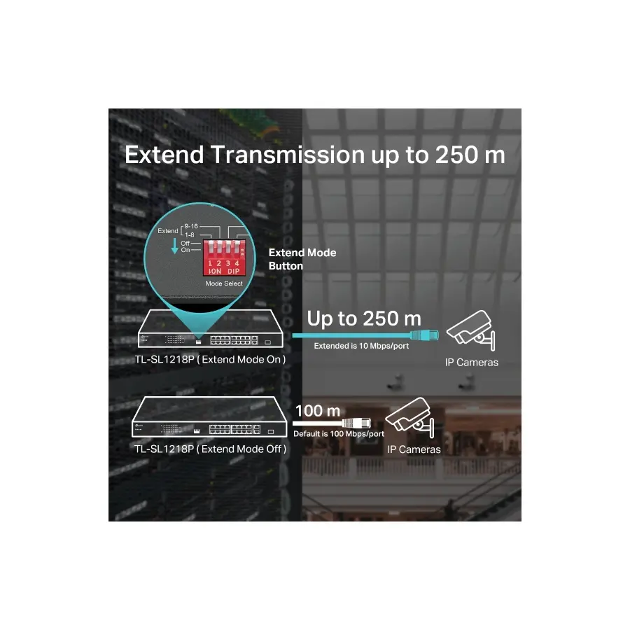 TP-Link TL-SL1218P is an 18-port Gigabit Rackmount switch designed for small and medium-sized networks. The device provides high performance and speed, which is necessary for modern network infrastructure. The switch comes with 16 PoE+ (Power over Ethernet) ports, allowing you to connect and project devices such as IP cameras, Wi-Fi access points, and IP phones without an additional power source. Its maximum PoE power is 150 watts, which is ideal for energy saving. The compact design and rackmount form-factor ensure easy installation and integration into a variety of network environments. TP-Link TL-SL1218P features advanced security features and reliability that ensure stable and secure network operation.