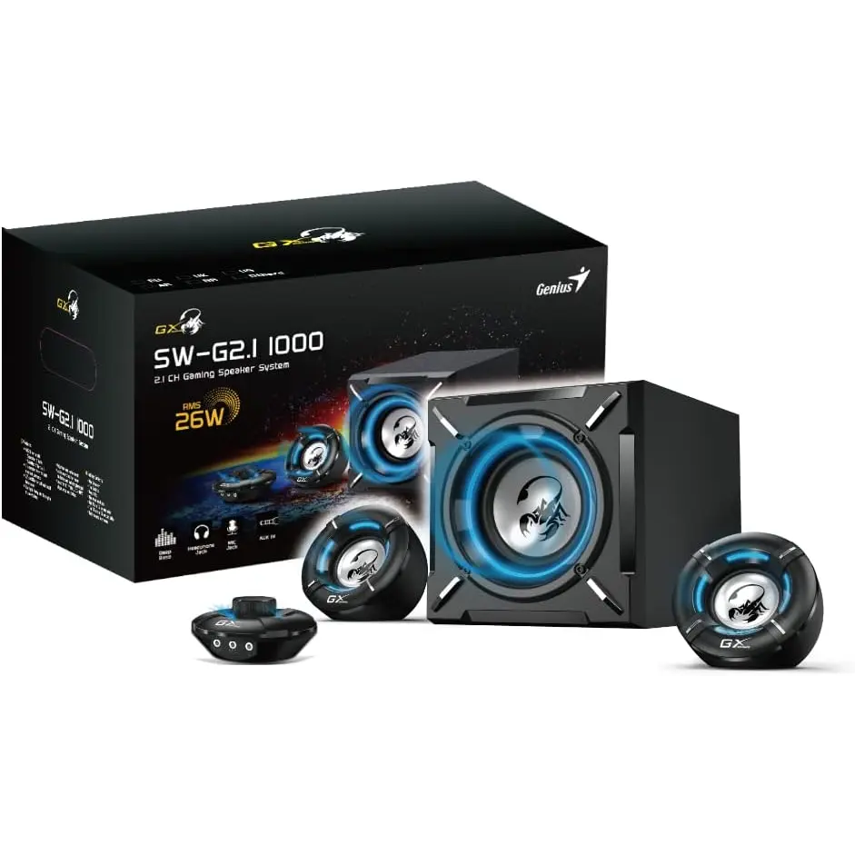 Genius SW-G2.1 1000 არის 2.1 არხიანი გეიმინგ აუდიო სისტემა, რომელიც უზრუნველყოფს 26 ვატიან მძლავრ და დაბალანსებულ ხმოვანებას. 5 დიუმიანი სუბვუფერი აწვდის ღრმა ბასს, ხოლო ორი 2.5 დიუმიანი სატელიტი უზრუნველყოფს მკვეთრ და სუფთა მაღალ სიხშირეებს. მოწყობილობას აქვს რეგულირებადი ბასის კონტროლი და ხაზზე განთავსებული პულტი, რომელიც საშუალებას გაძლევთ მარტივად მართოთ ხმის დონე, ასევე გამოიყენოთ ყურსასმენი და მიკროფონი. ლურჯი LED განათება სინქრონიზებულია ბასის რიტმთან, რაც ქმნის დინამიურ ვიზუალურ ეფექტს. RCA და 3.5 მმ აუდიო შეყვანები უზრუნველყოფს მრავალფეროვან კავშირს კომპიუტერებთან, კონსოლებთან და სხვა მოწყობილობებთან. კომპაქტური დიზაინი და შავი ფერი იდეალურად ერგება ნებისმიერ გეიმინგ გარემოს.