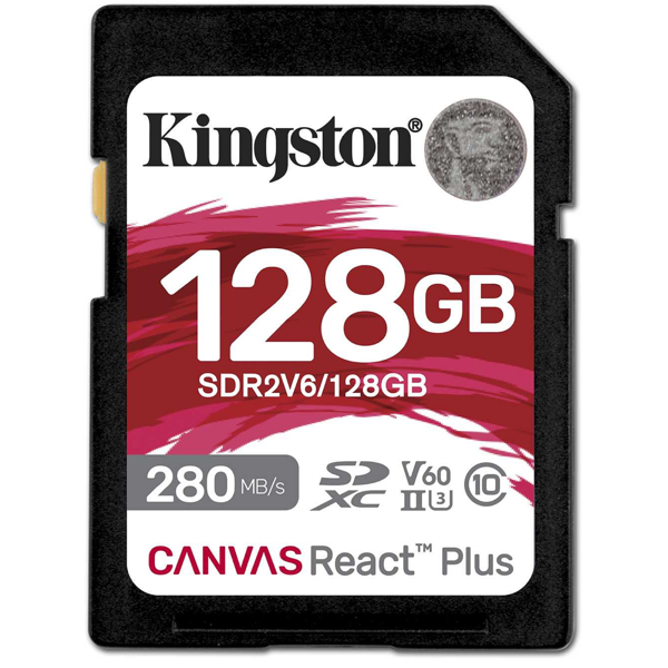 მეხსიერების ბარათი Kingston 128GB Canvas React Plus SDXC UHS-II 280R/100W U3 V60 for Full HD/4K