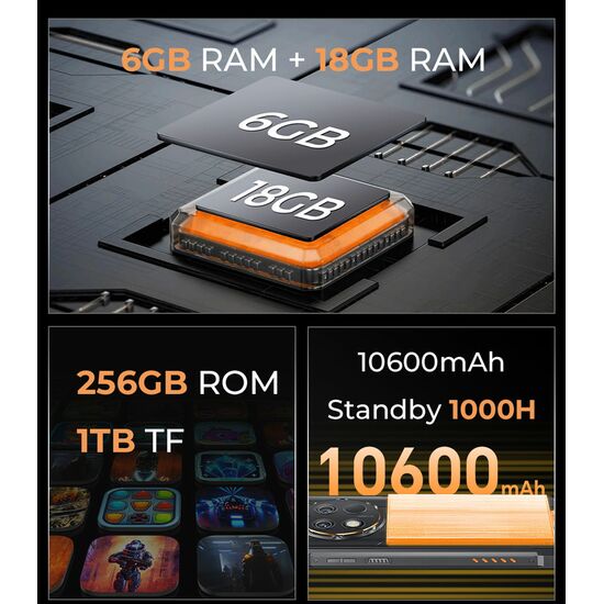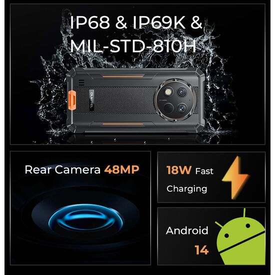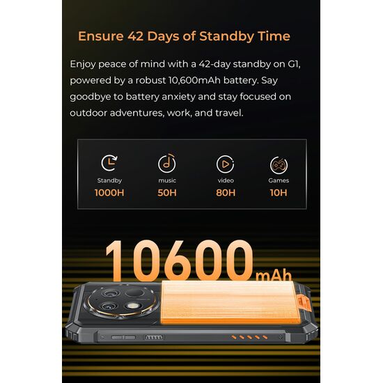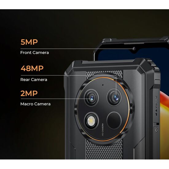 Oukitel G1 Black არის გამძლე სმარტფონი, რომელიც აერთიანებს მაღალტექნოლოგიურ შესაძლებლობებსა და გამძლე დიზაინს. მისი 6.52-დუიმიანი HD IPS ეკრანი, დაცული Corning Gorilla Glass 5-ით, უზრუნველყოფს მკაფიო გამოსახულებასა და დაცვას. მოწყობილობა აღჭურვილია 6GB RAM-ით, რომელიც ვირტუალურად იზრდება 24GB-მდე, და 256GB შიდა მეხსიერებით, რომელიც შესაძლებელია გაფართოვდეს 1TB-მდე microSD ბარათით. Unisoc T606 პროცესორი და Android 14 ოპერაციული სისტემა უზრუნველყოფს სწრაფ და სტაბილურ მუშაობას. 48MP ძირითადი კამერა Sony IMX582 სენსორით და 2MP მაკრო ობიექტივი იძლევა მაღალი ხარისხის ფოტოების გადაღების შესაძლებლობას. 10600mAh ბატარეა 18W სწრაფი დატენვით უზრუნველყოფს ხანგრძლივ მუშაობას. მოწყობილობა სერტიფიცირებულია IP68/IP69K და MIL-STD-810H სტანდარტებით, რაც ნიშნავს წყალგამძლეობასა და დაცვას მტვრისა და დაცემისგან.