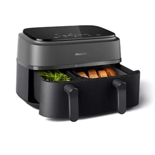 Philips NA350/00 3000 სერიის ორმაგი კალათის აეროგრილი იდეალურია მათთვის, ვისაც სურს სწრაფი, ჯანსაღი და მრავალფეროვანი მომზადება. მისი 9 ლიტრიანი საერთო ტევადობა (6 ლიტრი ძირითადი და 3 ლიტრი დამატებითი კალათა) საშუალებას გაძლევთ ერთდროულად მოამზადოთ ძირითადი კერძი და გარნირი. Rapid Air Plus ტექნოლოგია უზრუნველყოფს ცხელი ჰაერის თანაბარ ცირკულაციას, რაც იძლევა ხრაშუნა და თანაბრად მომზადებულ საკვებს 90%-ით ნაკლები ცხიმით. მოწყობილობა აღჭურვილია 8 წინასწარ დაპროგრამებული რეჟიმით, რაც ამარტივებს სხვადასხვა ტიპის საკვების მომზადებას. სინქრონიზაციის ფუნქცია უზრუნველყოფს ორივე კალათის ერთდროულად დასრულებას, ხოლო "Copy" ფუნქცია საშუალებას გაძლევთ დააკოპიროთ დრო და ტემპერატურა ორივე კალათისთვის. Touchscreen პანელი და HomeID აპლიკაცია უზრუნველყოფს მარტივ მართვას და მრავალფეროვან რეცეპტებს. კალათები ადვილად იწმინდება და შესაძლებელია მათი ჭურჭლის სარეცხ მანქანაში მოთავსება.
