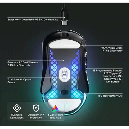 PrismSync RGB განათება საშუალებას გაძლევთ მოარგოთ განათების ეფექტები თქვენს გემოვნებას SteelSeries GG პროგრამის საშუალებით. TrueMove Air სენსორი 18,000 DPI-ით უზრუნველყოფს ულტრა-მაღალ სიზუსტეს და რეაგირებას, რაც გამარჯვებისთვის აუცილებელია.