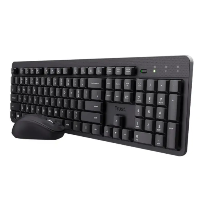 Trust Ody II Silent Wireless Keyboard & Mouse Set (მოდელი: 25018) გთავაზობთ კომფორტულ და მშვიდ სამუშაო გარემოს. კლავიატურა აღჭურვილია დაბალი პროფილის მემბრანული ღილაკებით, რომლებიც უზრუნველყოფენ ჩუმ და რბილ დაჭერას. 13 მულტიმედიური ღილაკი და რეგულირებადი კუთხე უზრუნველყოფს კომფორტულ გამოყენებას. მაუსი აღჭურვილია 800-1600 DPI სენსორით და სიმეტრიული დიზაინით, რაც უზრუნველყოფს ზუსტ და კომფორტულ მართვას. კომპლექტი მუშაობს ერთიანი USB მიმღებით, რომელიც ინახება კლავიატურაში. კლავიატურა და მაუსი მუშაობს ბატარეებზე (2x AAA კლავიატურისთვის, 1x AA მაუსისთვის), რაც უზრუნველყოფს ხანგრძლივ მუშაობას. კომპლექტი თავსებადია Windows, macOS და Chrome OS სისტემებთან.