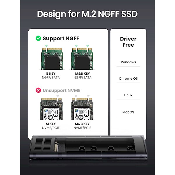 გარე მყარი დისკის ქეისი UGREEN 10903 M.2 SATA NGFF SSD Enclosure, Aluminum USB 3.1 Gen 2 to B-Key 6Gbps with External UASP Solid State Drive Enclosure