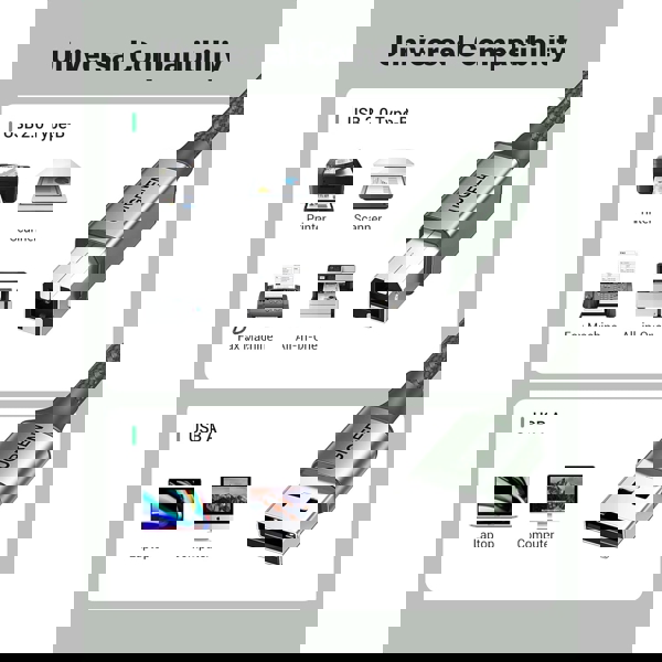 UGREEN 90817 პრინტერის კაბელი განკუთვნილია USB-A პორტის მქონე მოწყობილობებისა და USB-B პორტის მქონე პრინტერების დასაკავშირებლად. მისი 3-მეტრიანი სიგრძე უზრუნველყოფს დამატებით მოქნილობას და კომფორტს, რაც საშუალებას გაძლევთ ეფექტურად მოაწყოთ სამუშაო სივრცე. კაბელი მხარს უჭერს მონაცემთა სტაბილურ და სწრაფ გადაცემას, რაც აუცილებელია მაღალი ხარისხის ბეჭდვისთვის. გამძლე მასალები და მყარი კონსტრუქცია უზრუნველყოფს ხანგრძლივ გამოყენებას. გამორჩეული მწვანე ფერი დიზაინს უნიკალურობასა და ელეგანტურობას სძენს.