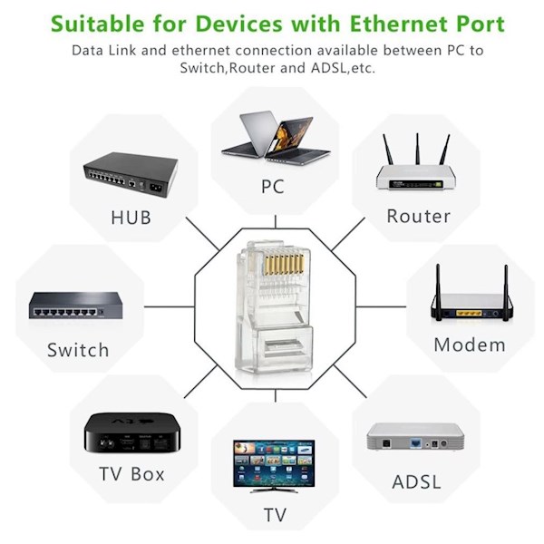 - მოწყობილობის ტიპი: RJ45 ქსელის კაბელის კონექტორი