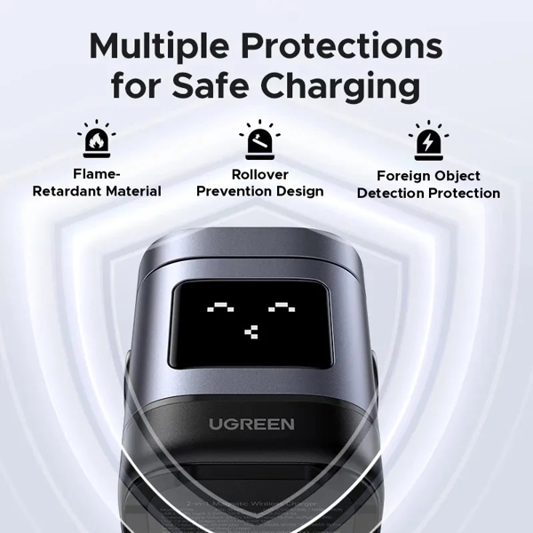 UGREEN Uno W709 (45775) Qi2 უსადენო დამტენი გთავაზობთ 15W სიმძლავრის სწრაფ და სტაბილურ დატენვას. 2-in-1 Magnetic Wireless Charger ფუნქცია საშუალებას გაძლევთ ერთდროულად დატენოთ iPhone, AirPods ან სხვა Qi-თან თავსებადი მოწყობილობები. ჩაშენებული მაგნიტური სისტემის წყალობით, თქვენი სმარტფონი მყარად და ზუსტად ჯდება დამტენზე, რაც უზრუნველყოფს მაქსიმალურ ეფექტურობას. კომპაქტური და ელეგანტური დიზაინი იდეალურია როგორც სამუშაო მაგიდისთვის, ასევე მოგზაურობისთვის. უსაფრთხოების მრავალფეროვანი მექანიზმები იცავს მოწყობილობებს გადახურების, გადატვირთვისა და ძაბვის უეცარი ცვლილებებისგან.