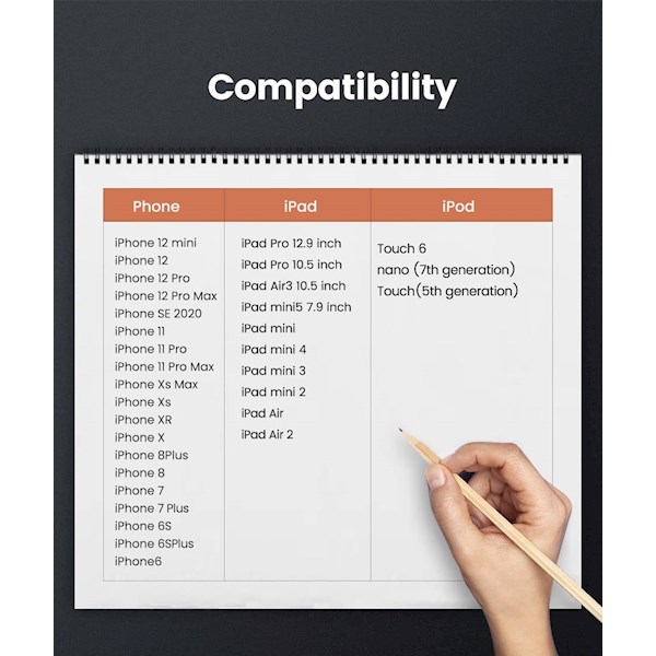 - თავსებადია iPhone, iPad Air, iPad mini / mini2, iPad მე -4 თაობის, iPod მე -5 თაობის და iPod nano მე -7 თაობისთვის