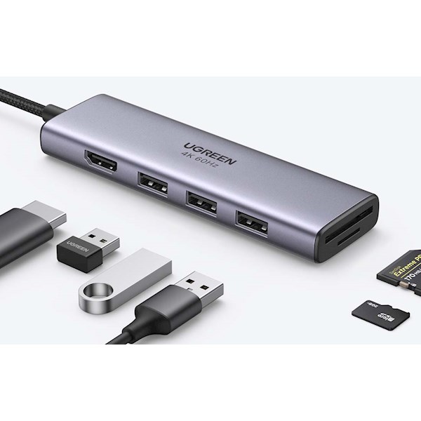 USB-C ჰაბი UGREEN CM511 (60384), 5-in-1 Adapter, USB-C Hub to 3xUSB3.0, HDMI, TF/SD, Gray