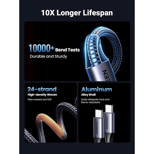 UGREEN US561 USB-C კაბელი გთავაზობთ მძლავრ და საიმედო დატენვისა და მონაცემთა გადაცემის შესაძლებლობას. 100W სიმძლავრის მხარდაჭერით (PD 5A/20V), იგი იდეალურია ლეპტოპების, ტაბლეტების, სმარტფონებისა და სხვა Type-C მოწყობილობების სწრაფად დასატენად. 1.5 მეტრიანი სიგრძე უზრუნველყოფს მოხერხებულობას ყოველდღიურ გამოყენებაში, იქნება ეს სახლში, ოფისში თუ მოგზაურობისას. კაბელი დამზადებულია მტკიცე და გამძლე მასალისგან, რომელიც გარე ზემოქმედებისადმი გამძლეობით გამოირჩევა. თანამედროვე გრეისფერი დიზაინი პრაქტიკულობასა და ელეგანტურობას იდეალურად აერთიანებს.